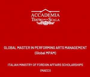 - Meanwhile or later, send an email to management@accademialascala.it by October 1 2025, confirming you want to apply for the MAECI scholarship. Please put in the email subject “Global MPAM Scholarship MAECI” and include a .pdf attachment in English (350 words max), explaining the reasons why you have chosen to study in Italy and to attend the Master at Accademia Teatro alla Scala. This is an extra document, in addition to the ones required to apply for the Global MPAM.
