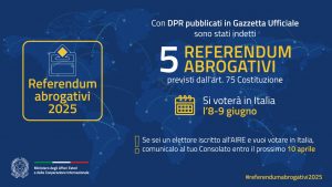 Con decreti del Presidente della Repubblica del 31/03/2025, pubblicati nella Gazzetta Ufficiale del 31/03/2025, è stata fissata ai giorni 8 e 9 GIUGNO 2025 la data dei referendum abrogativi ex art. 75 della Costituzione.